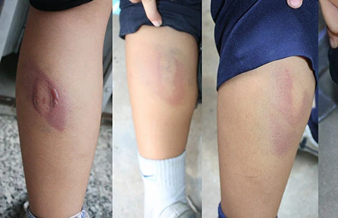 Những vết bầm tím ở chân các em học sinh. Ảnh: V.NGỌC