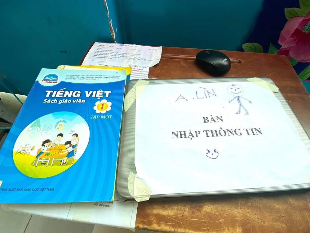 Năm học mới, cô Linh được phân công chủ nhiệm lớp 1. Từ đầu tháng 9 cô đã nhận lớp, gặp gỡ phụ huynh để nắm tình hình. Ở lại tại điểm tiêm nhưng cô vẫn mang theo máy tính và sách giáo khoa để tiện soạn giáo án.