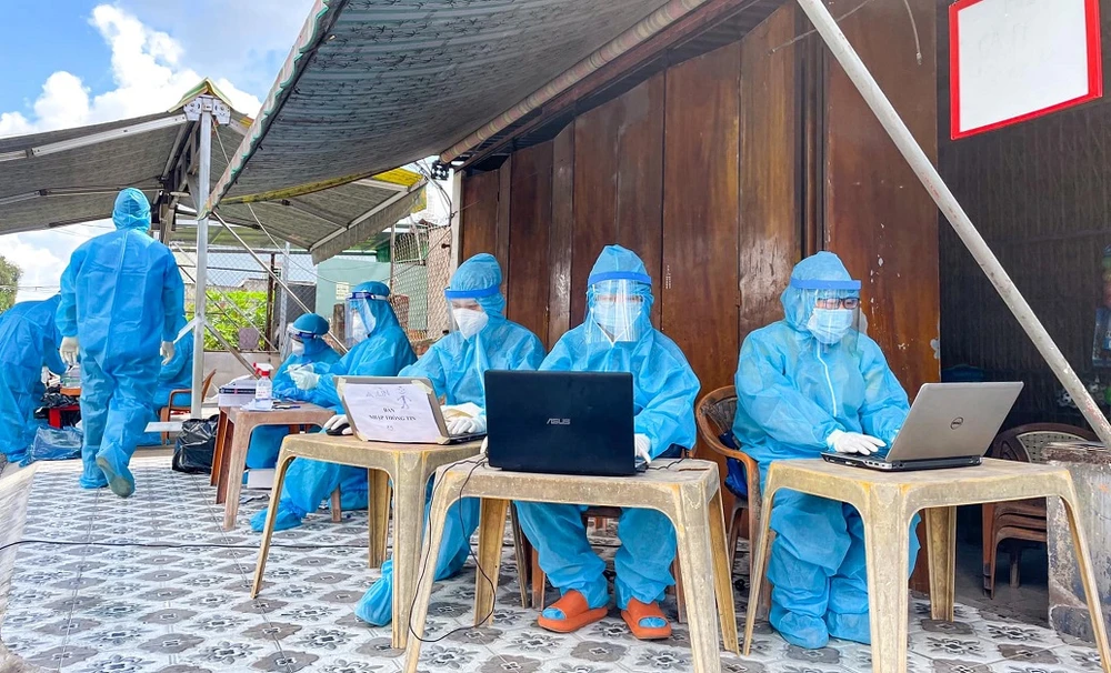 Cô Linh (bên trái) đang nhập liệu lấy mẫu ở xã Phạm Văn Hai, huyện Bình Chánh. Ảnh: NVCC