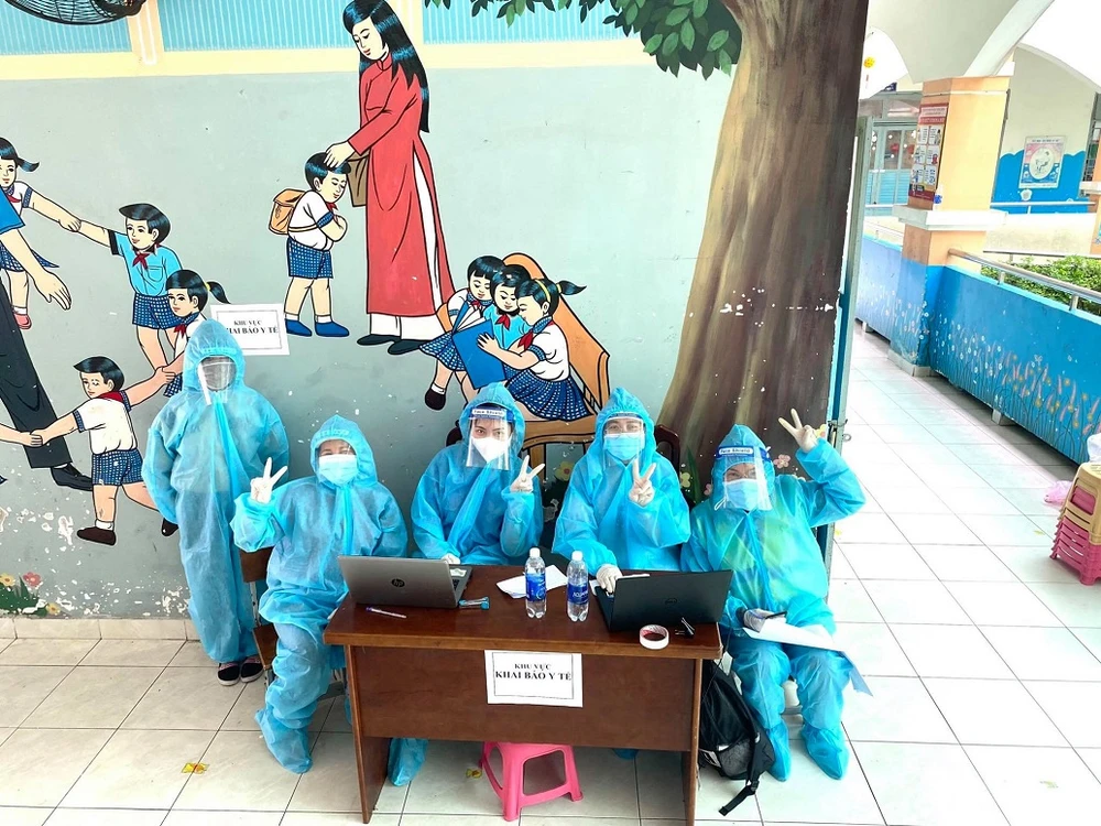 Từ giữa tháng 7-2021, khi điểm tiêm vaccine tại Trường Tiểu học An Hạ (huyện Bình Chánh, TP.HCM) đi vào hoạt động, nhiều giáo viên đã đăng ký hỗ trợ tại đây. Cô giáo Lộ Thị Thanh Ngân (28 tuổi) và Lâm Thị Ngọc Linh (25 tuổi) là hai trong số đó.
