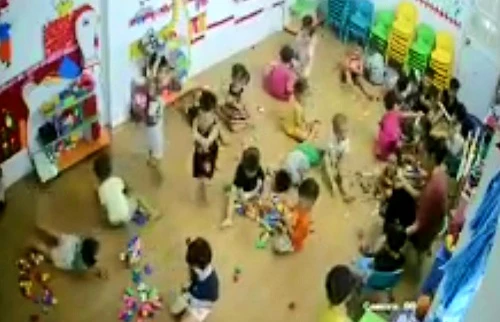 Hình ảnh lớp học mầm non được đăng tải trên mạng xã hội cho rằng cô giáo bắn dây thun vào học sinh. Ảnh cắt từ clip