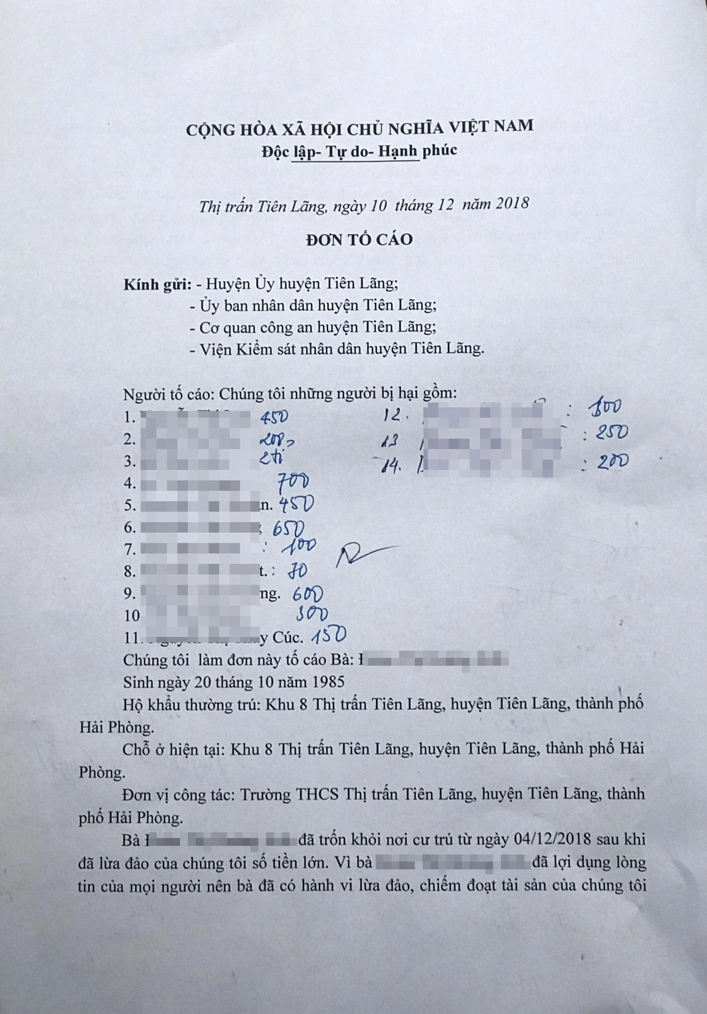 Theo tố cáo, chỉ riêng Trường THCS thị trấn Tiên Lãng, cô HA đã ôm của hơn chục thầy cô giáo số tiền vài tỉ đồng. Ngoài ra, cô HA còn vay của không ít giáo viên nghỉ hưu, một số người dân tại thị trấn Tiên Lãng với số tiền lên tới cả chục tỉ đồng.