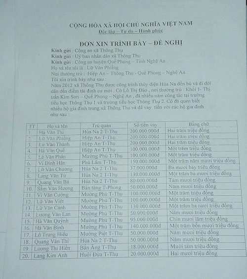 Các hộ dân cho biết năm 2012, họ di dời để xây dựng công trình thủy điện Hủa Na (huyện Quế Phong) và các hộ dân nhận được một khoản tiền tiền đền bù khi di dời. Cô Đào nhiều năm công tác trên địa bàn xã Thông Thụ biết được các hộ dân có tiền đền bù nên đã hỏi vay tiền. Các hộ dân tin tưởng cô giáo nên đã cho cô vay người ít nhất là 18 triệu, người nhiều thì 200 triệu đồng. Khi vay tiền, cô Đào có viết giấy vay nợ và có hẹn ngày trả.