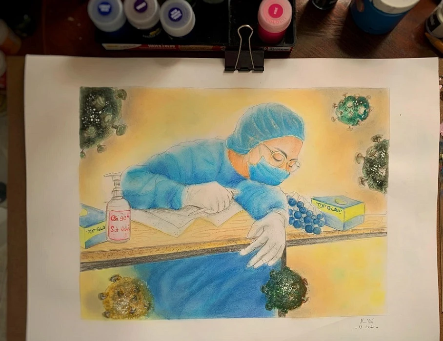Cô Hồng Yến kể: “Những bức tranh được tôi vẽ trong đợt dịch COVID-19 lần thứ hai tại Việt Nam (tháng 8-2020). Nội dung các bức vẽ tái hiện lại hình ảnh công việc, những khó khăn, vất vả và sự hy sinh to lớn của lực lượng tuyến đầu phòng chống dịch, trong đó có các y bác sĩ, chiến sĩ công an, bộ đội, lực lượng địa phương”.