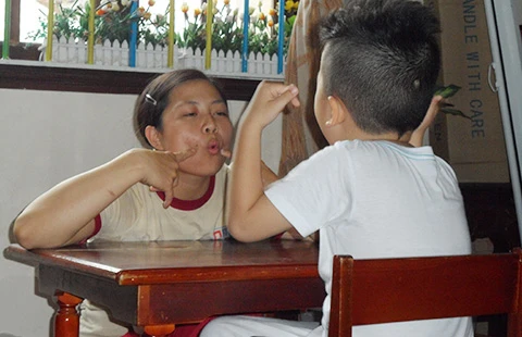 Cô Hằng dạy bé NHT tập phát âm. Ảnh: NGUYỄN TRÀ