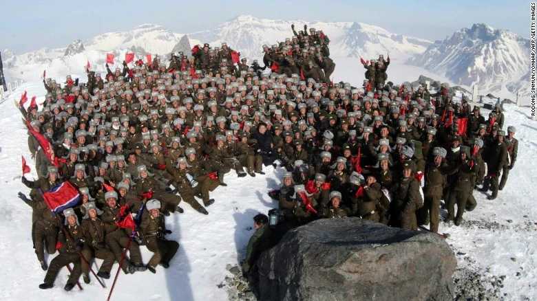 Ông Kim Jong Un cùng với đoàn binh sĩ trên đỉnh Paektu ngày 18-4 (CNN)