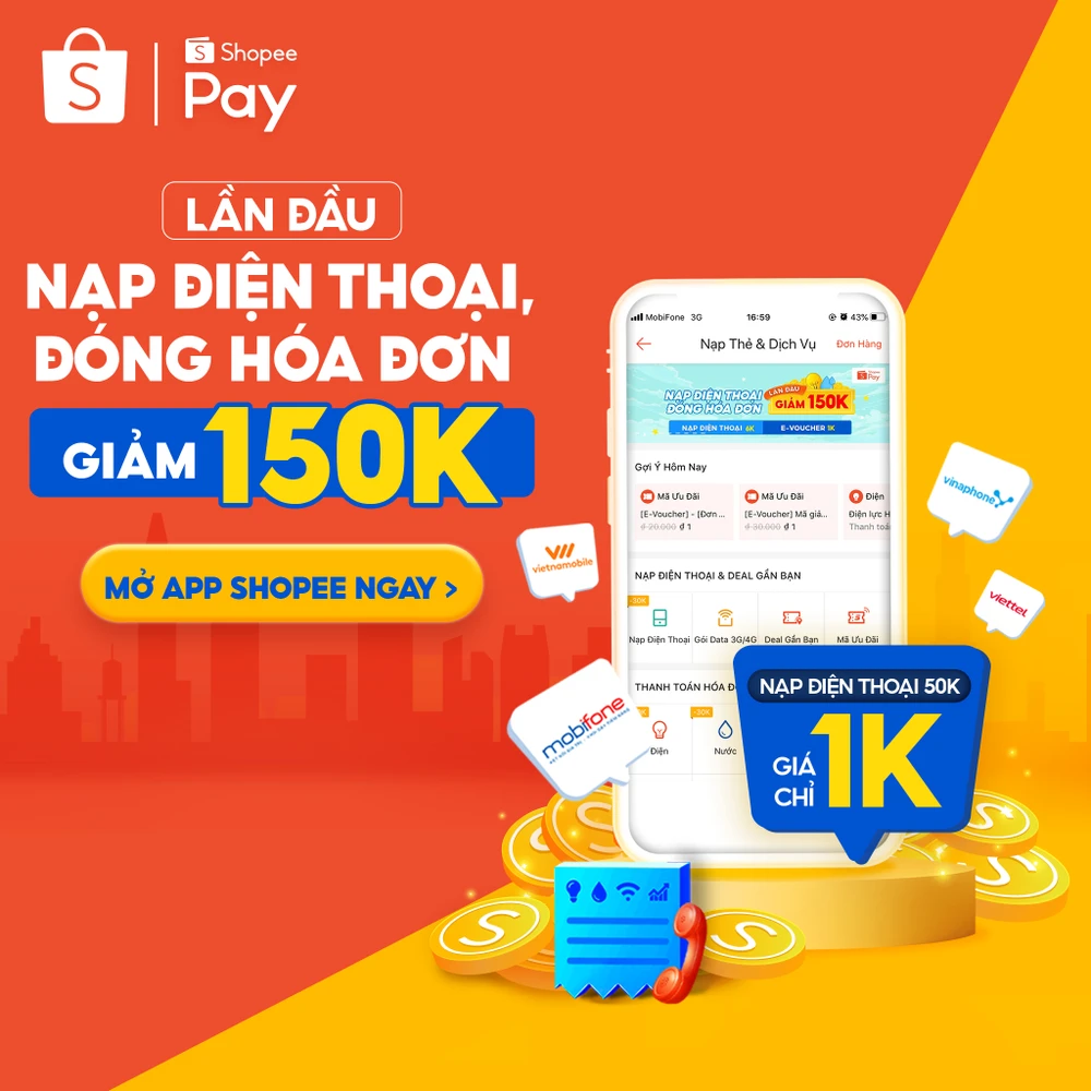 Với người dùng lần đầu tiên liên kết và sử dụng ví ShopeePay để nạp điện thoại và thanh toán hóa đơn trên ứng dụng Shopee sẽ có cơ hội nhận được ưu đãi chào mừng với giá trị hấp dẫn. Ưu đãi gồm khuyến mãi nạp điện thoại 50.000 đồng với giá chỉ 1.000 đồng và gói gồm 5 voucher trị giá 150.000 đồng, dùng cho 5 tiện ích gồm nạp điện thoại, thanh toán điện, nước, Internet và hóa đơn tài chính.