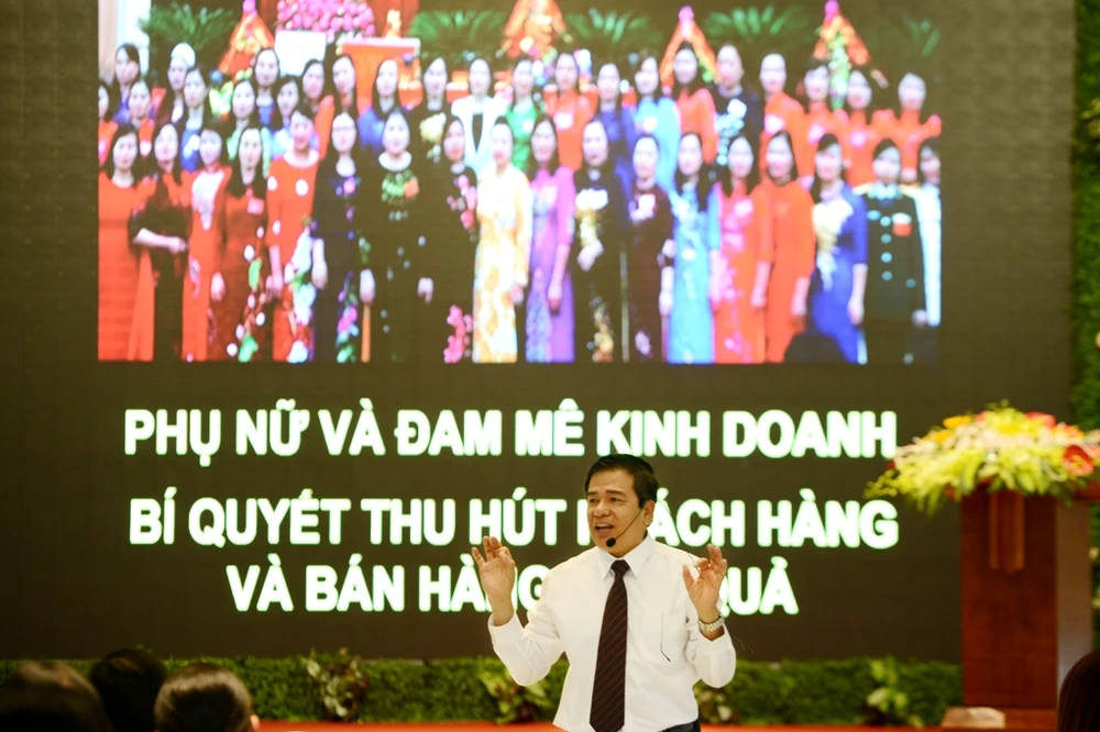 Ông Nguyễn Văn Tòng, đại diện Trung tâm nghiên cứu kinh doanh và khởi nghiệp trình bày tại sự kiện Ngày phụ nữ sáng tạo - khởi nghiệp ở Thanh Hóa.