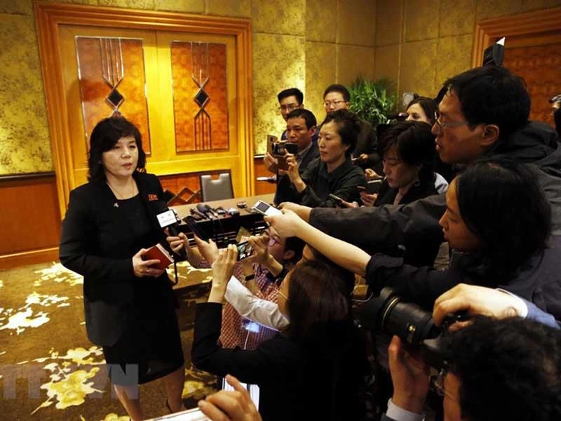 Thứ trưởng Ngoại giao Triều Tiên Choe Son-hui trao đổi với báo chí vào nửa đêm 28-2 tại Hà Nội. Ảnh: TTXVN
