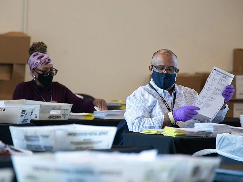 Nhân viên bầu cử làm việc xuyên ngày đêm tại một phòng kiểm phiếu ở TP Atlanta, bang Georgia (Mỹ) ngày 4-11. Ảnh: GETTY IMAGES