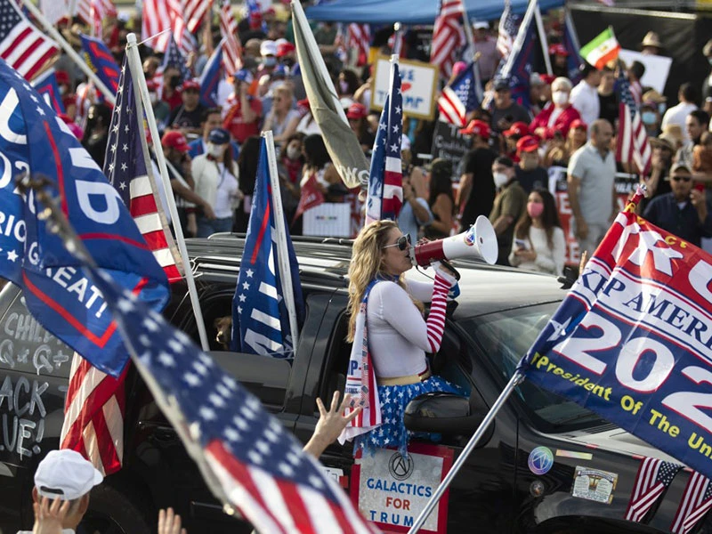 Người ủng hộ Tổng thống Donald Trump xuống đường biểu tình ở TP Beverly Hills, bang California ngày 3-11. Ảnh: AFP