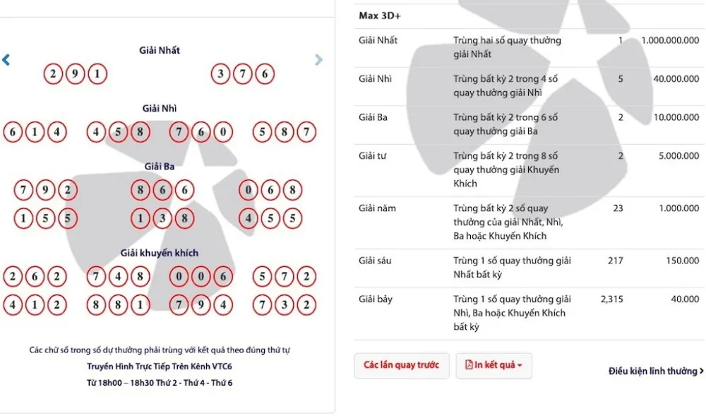 Theo đó, khi cả hai bộ số trên vé Max 3D+ trùng khớp với hai bộ số ở giải nhất của Max 3D là sẽ trúng 1 tỉ đồng. Ngoài ra, trường hợp trùng khớp hai trong bốn bộ số ở giải nhì, sáu bộ số ở giải ba hoặc tám bộ số ở giải khuyến khích của Max 3D, người chơi Max 3D+ sẽ tương ứng trúng 40 triệu đồng (giải nhì), 10 triệu đồng (giải ba) hoặc 5 triệu đồng (giải tư).