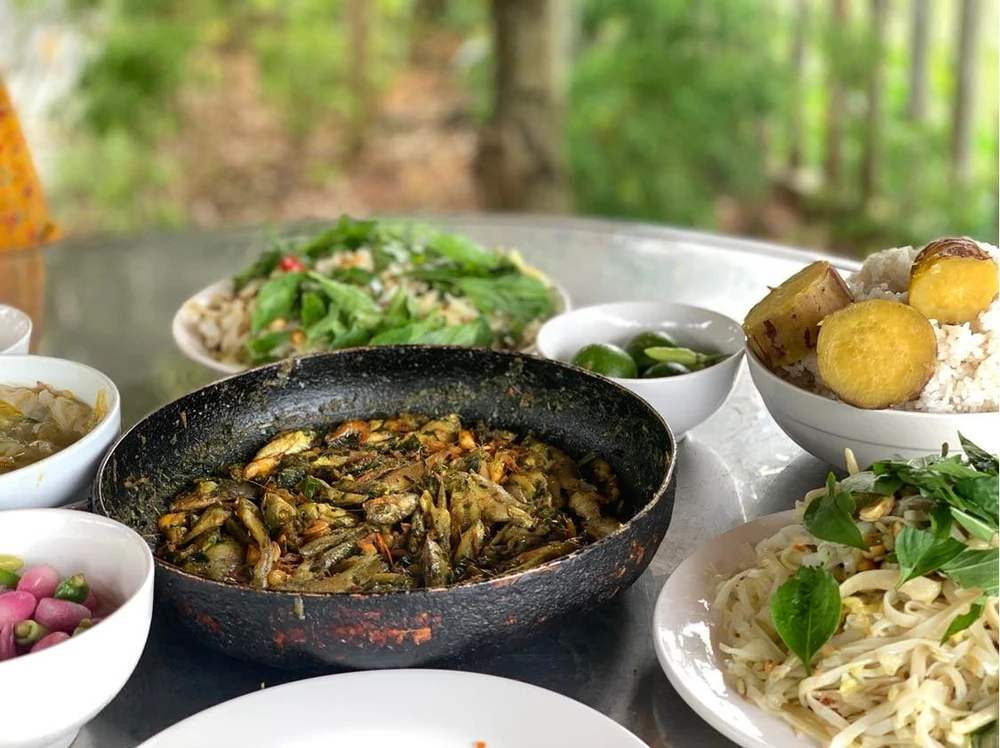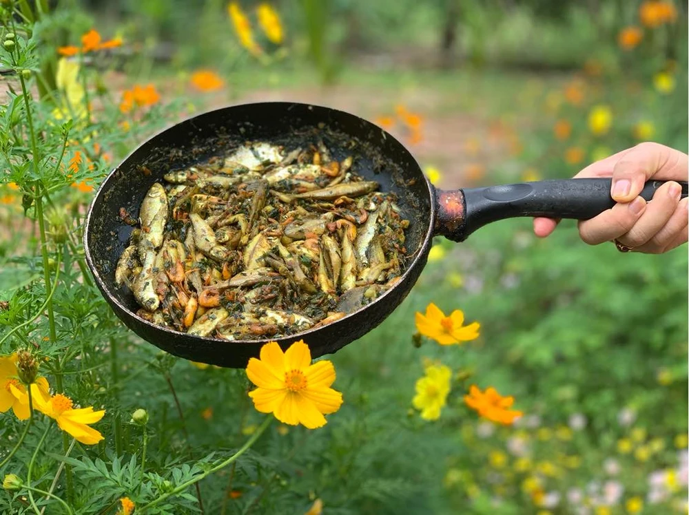 Cá ức nước nhảy bờ, người quê kéo cái rớ bắt mớ cá nhép lộn xộn cùng bầy tép bạc vỏ mỏng tanh trong veo như mắt mèo lúp xúp. Có mớ cá cấn cá mại ruột béo mập đỏ đỏ lẫn với bầy tép bạc là nghĩ ngay đến đám lá nghệ non góc vườn.