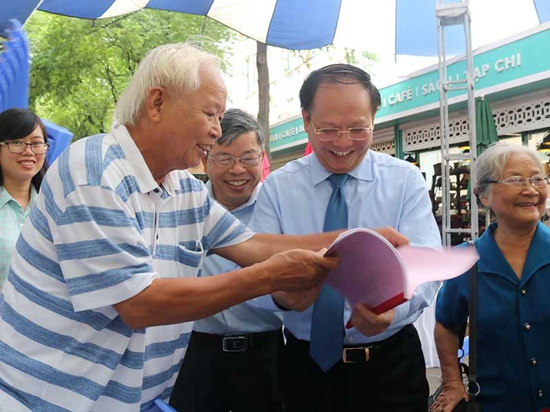 Ông Đặng Giao Hưởng ngỏ ý tặng ông Tất Thành Cang - Phó Bí thư Thường trực Thành ủy TP.HCM một số tài liệu về nước Nga trong buổi khai mạc Tuần lễ sách Nga tại TP.HCM. Ảnh: LẠC HIÊN