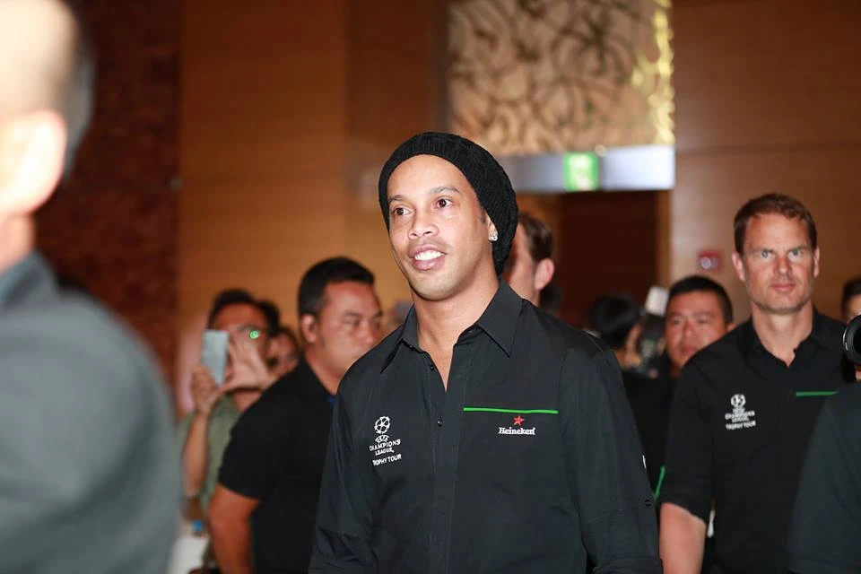 Đi cùng Ronaldinho trong chuyến “công vụ” này còn có hai cựu danh thủ khác là anh em nhà De Boer gồm Ronald và Frank, vài ngày nữa một cựu siêu sao khác sẽ đến là Clarence Seedoft. Ronaldinho ngoài đời trông cũng không khác nhiều so với những ngày còn thi thố trên sân. Vẫn nụ cười “thương hiệu” thường trực trên môi và bẽn lẽn.