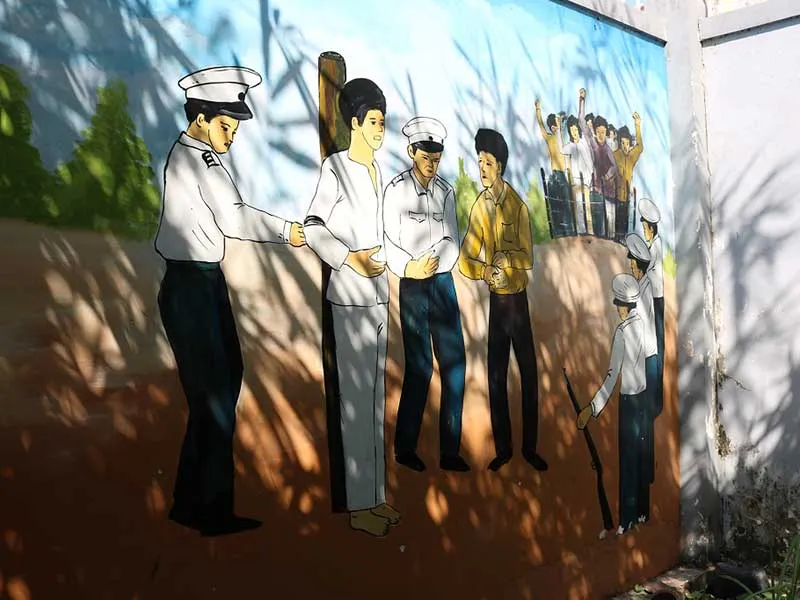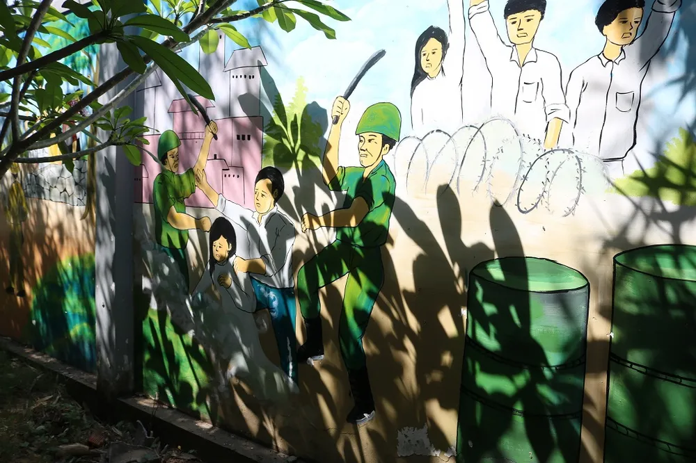Cảnh đánh đập, đàn áp bên những rào kẽm thép gai được thể hiện trên tranh tường.