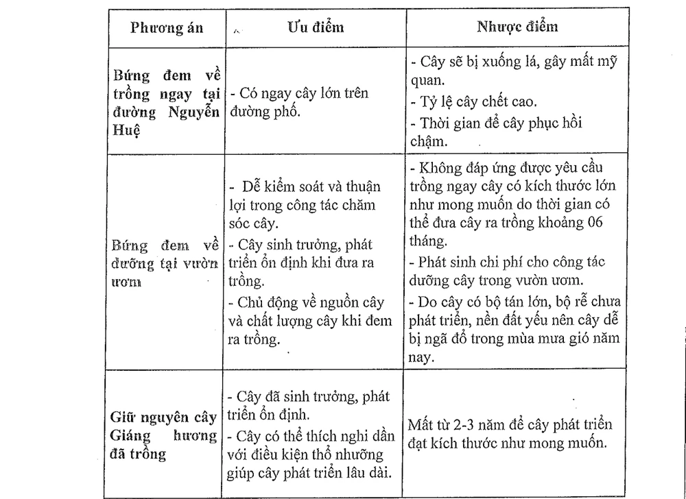 Dựa trên phân tích của chuyên gia, Công ty Công viên Cây xanh TP kiến nghị nên giữ lại những cây giáng hương đã trồng trên đường Nguyễn Huệ. “Trường hợp trồng cây giáng hương có kích thước lớn như mong muốn thì nên bứng về dưỡng tại vườn ươm. Sau khi cây phát triển ổn định mới đưa ra trồng”, Công ty Công viên Cây xanh nêu ý kiến.