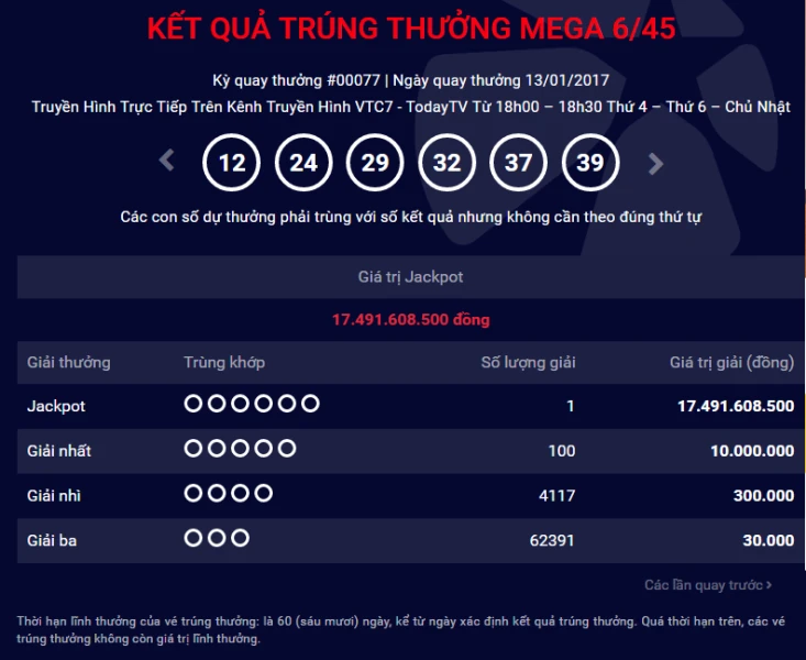 Tại kì quay thưởng ngày 13-1, Công ty Xổ số điện toán Việt Nam xác định có một vé trúng giải jackpot (độc đắc) có giá trị 17,4 tỉ đồng. Dãy số may mắn là 12-24-29-32-37-39. Đây là người thứ 12 trúng số jackpot và người thứ hai liên tiếp gặp may mắn với giải độc đắc sau kỳ quay ngày 11-1.