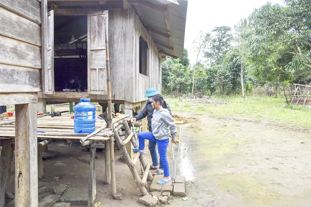 Anh Lập dìu con gái bị bệnh viêm xương lên nhà. Ảnh: NGUYỄN DO