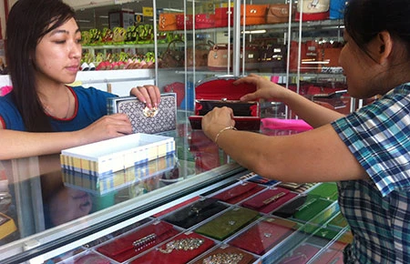 Trong vai một khách hàng muốn đặt bộ khay đào đắp bạc, chúng tôi ghé vào tiệm bán đồ mỹ nghệ tại chợ Bến Thành (quận 1). Giá niêm yết là 550.000 đồng/bộ gồm ba khay. Hỏi có giảm giá được không, người bán hàng cho biết có thể bớt 20.000 đồng/bộ. Thấy giá còn cao, chúng tôi rời tiệm thì người bán nói sẽ giảm thêm 50.000 đồng nữa. Người này còn tiết lộ nếu gặp khách du lịch thì sẽ nói giá cao hơn. Sang một tiệm khác, sản phẩm như trên có giá đến 750.000 đồng/bộ. Khi chúng tôi nói muốn đặt khoảng 30 bộ, tiệm này cho giá 410.000 đồng/bộ.
