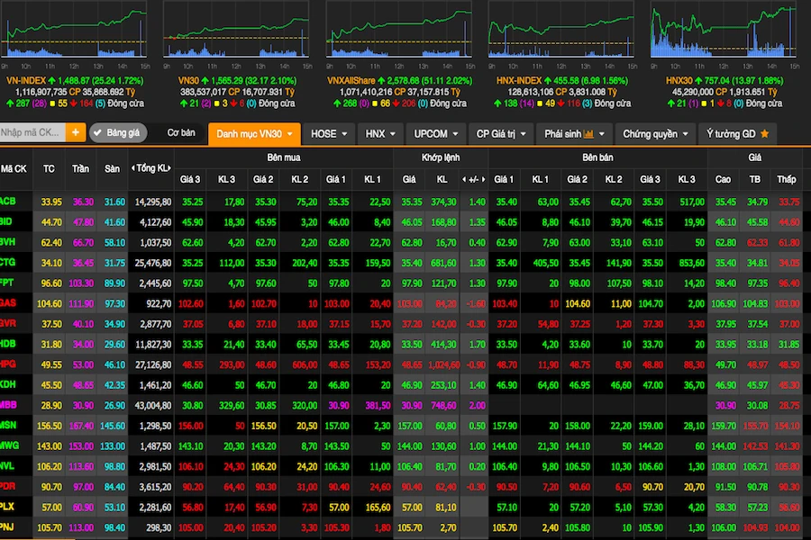 Chốt phiên giao dịch hôm nay, chỉ số VN-Index tăng 25,24 điểm (tương đương tăng 1,72%) lên 1.488,87 điểm. Bên cạnh đó chỉ số VN30 cũng vọt 32,17 điểm (tăng 2,1%) lên 1.565,29 điểm.