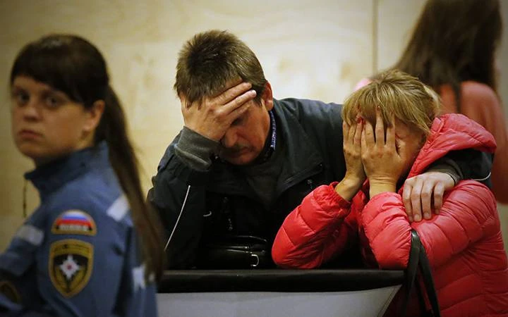 Thân nhân của hành khách trên chiếc Airbus A321 của hãng Metrojet chờ đợi tại St.Petersburg, Nga ngày 31-10. Ảnh: EPA