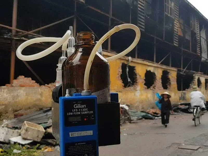 Sở TN&MT TP Hà Nội lắp máy quan trắc môi trường sau sự cố cháy kho hàng của Công ty Rạng Đông. Ảnh: AN HIỀN