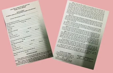 Mẫu bản cam kết về phòng, chống tệ nạn mại dâm. Ảnh: H.LAN
