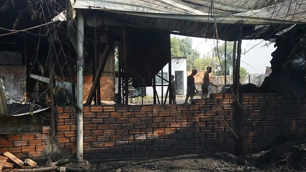 Tại hiện trường, phần lớn phần mái che nơi cơ sở sản xuất bột nhang đều hư hỏng, đổ sập. Nhiều cây xanh xung quanh cơ sở này bị cháy khô.
