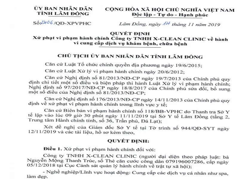 Ngày 16-11, UBND tỉnh Lâm Đồng cho hay cơ quan này vừa có quyết định xử phạt vi phạm hành chính đối với Công ty TNHH X-CLEAN CLINIC (địa chỉ 79C Thông Thiên Học, phường 8, TP Đà Lạt, Lâm Đồng) về hành vi cung cấp dịch vụ khám chữa bệnh.