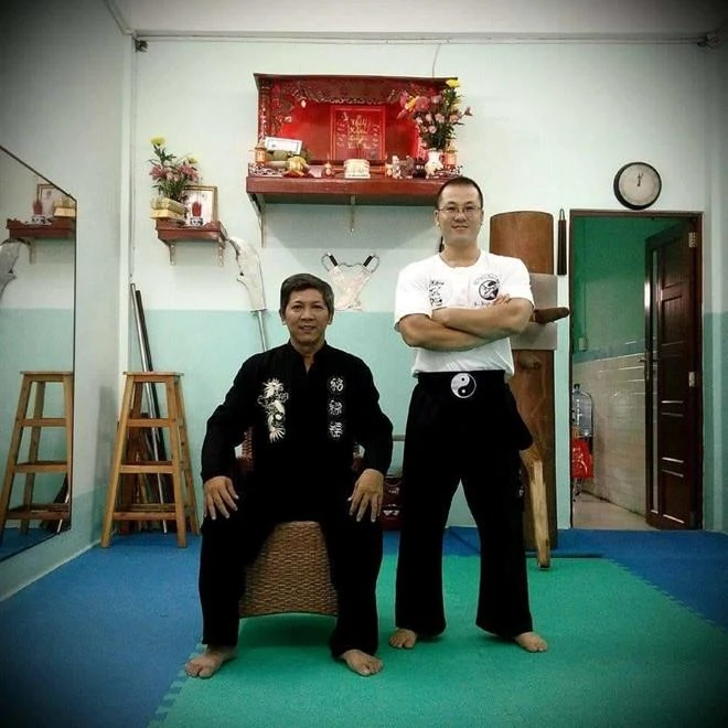 Võ sư Nam Anh Kiệt (người ngồi) chưởng môn phái Vịnh Xuân Nam Anh bị tố kéo đệ tử đánh hội đồng võ sư Khánh. Ảnh: FBNV