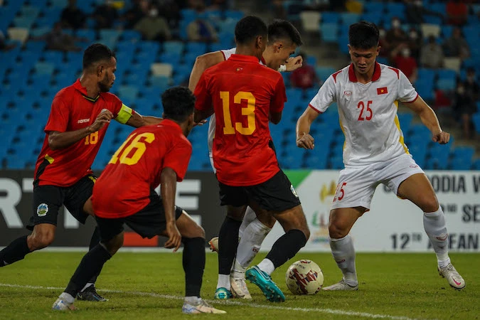 Các tuyển thủ trẻ Việt Nam đua sức với Đông Timor suốt 120 phút và thắng trên chấm luân lưu. Ảnh: AN.