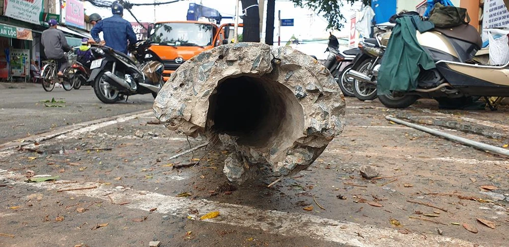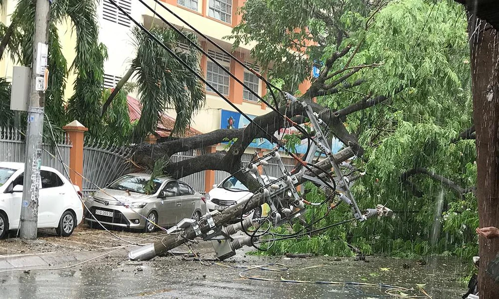 Cây đổ đè sập hàng rào sắt của trường học, máng vào đường dây hạ thế kéo gãy hai trụ điện ở đường Thạch Lam và Nguyễn Lý tạo ra tiếng động lớn.