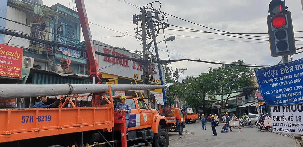 Đến chiều 3-7, lực lượng chức năng quận Tân Phú phối hợp với nhân viên Công ty Điện lực TP.HCM xử lý hiện trường vụ cây cổ thụ bật gốc ở giao lộ Thạch Lam – Trần Quang Cơ – Nguyễn Lý (phường Phú Thạnh, quận Tân Phú).