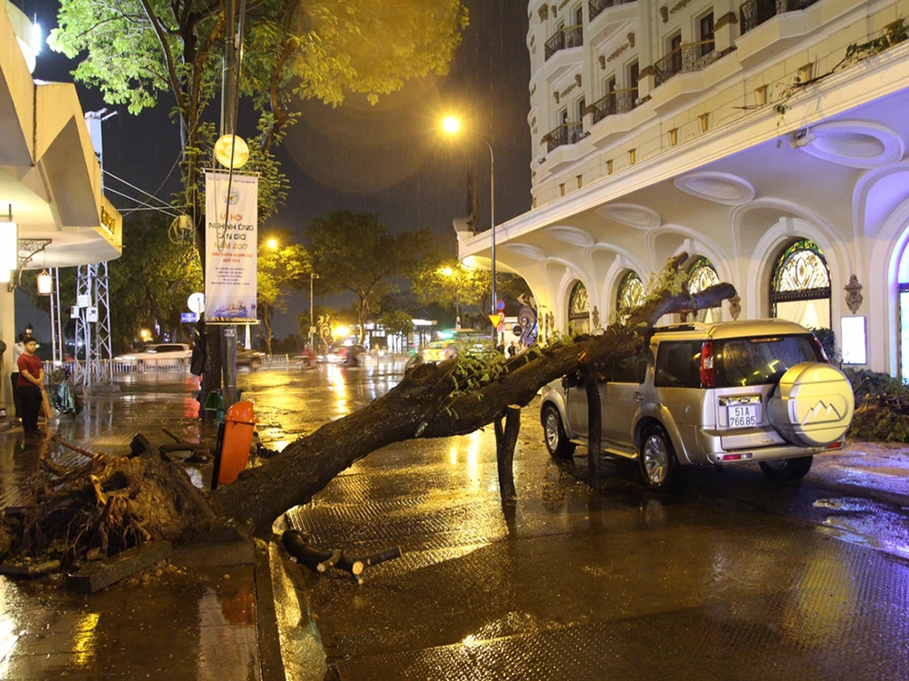 Cây ngã đè trúng xe ở trung tâm TP trong cơn mưa lớn. Ảnh: H.TÂM