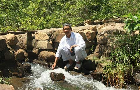 Ông Năm Tốt bên một con đập dẫn nước từ Sình Bà Bão về. Ảnh: VIỄN SỰ