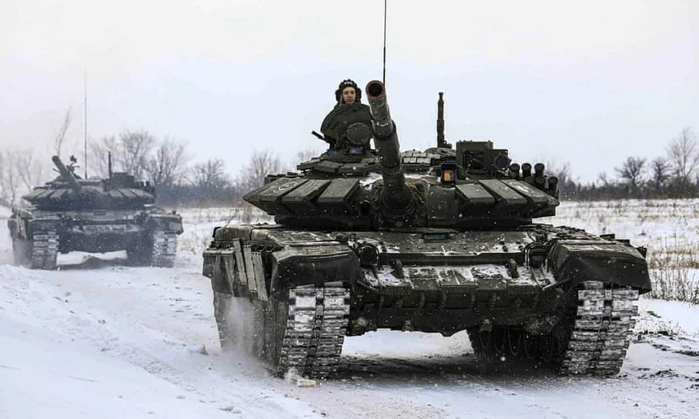 Xe tăng Nga trong một cuộc diễn tập quân sự. Các quan chức phương Tây ước tính số quân Nga tập trung gần biên giới với Ukraine chiếm hơn 60% lực lượng bộ binh nước này. Ảnh: AP