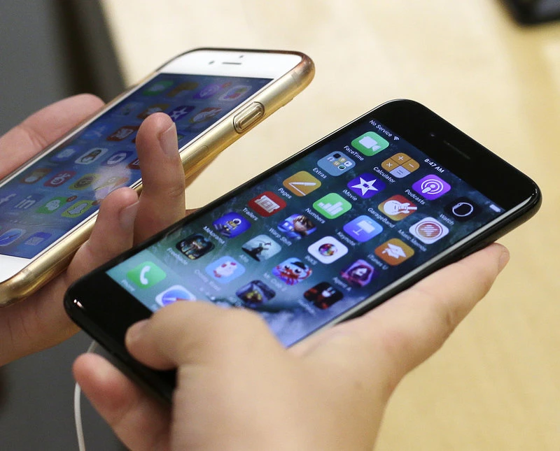 Một khách hàng so sánh iPhone 6 (trái) của mình với iPhone 7 tại Cửa hàng Apple ở thành phố Chicago, bang Illinois. Ảnh: KIICHIRO SATO/AP