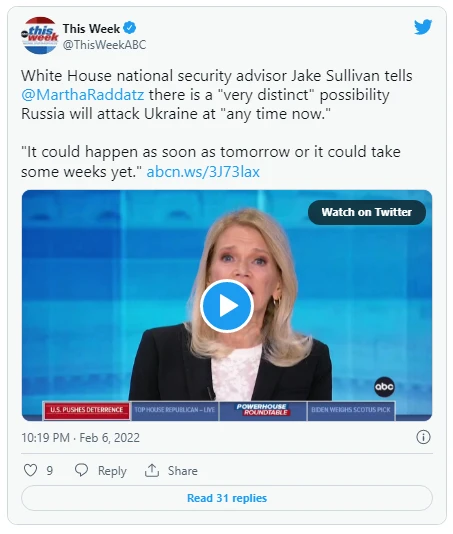 Trả lời phỏng vấn trên đài ABC, ông Sullivan lặp lại tuyên bố của các quan chức Mỹ khi không loại trừ khả năng Nga có thể tấn công Ukraine sớm “vào ngày mai”. Phía Mỹ liên tục có các phát ngôn này bất chấp việc Moscow liên tục bác bỏ cáo buộc cho rằng hoạt động chuyển quân nội bộ của họ là để chuẩn bị cho một cuộc tấn công vào Kiev.