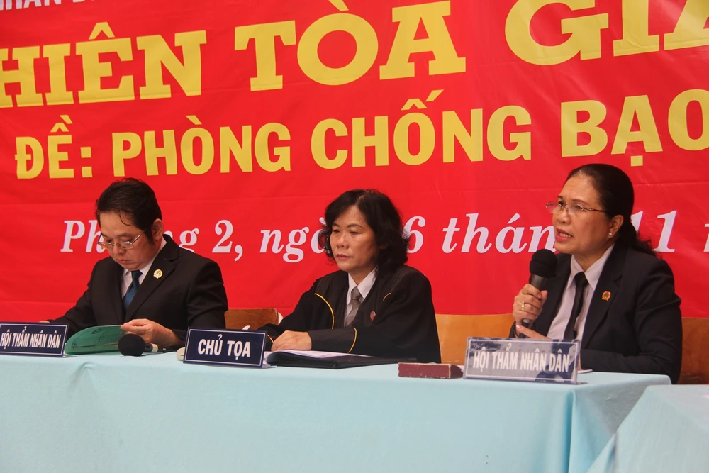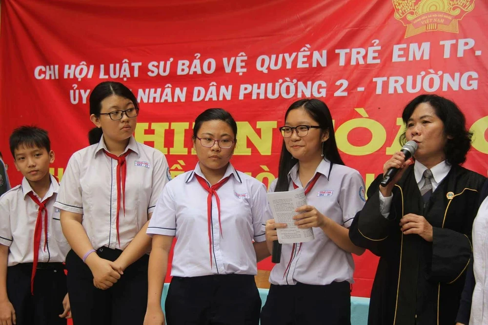 Luật sư Trần Thị Ngọc Nữ (Chi hội trưởng Chi hội Luật sư Hội Bảo vệ Quyền trẻ em TP.HCM) bật cười giải thích: "Đây là phiên tòa giả định, các nhân vật mà tụi con vừa thấy đều do các cô chú luật sư đóng. Việc này nhằm giúp các con hiểu về một phiên tòa là như thế nào, điều gì cần làm và không nên làm khi đối mặt với những mâu thuẫn trong mối quan hệ bạn bè, trường lớp"...
