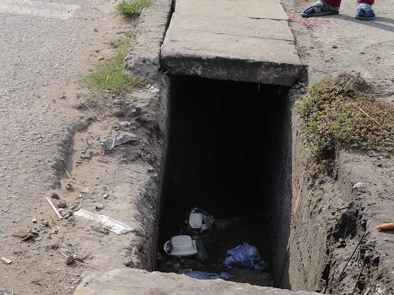 Mương hở hoác đang là mối nguy chực chờ người tham gia giao thông. Mương thoát nước ngang với mặt đường, người đi đường chỉ cần sơ suất một chút là có thể lọt mương bất cứ lúc nào. Ảnh chụp tại một ngã ba thuộc khu phố 4, thị trấn Bến Lức.