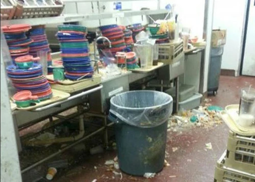 Đồ ăn thừa, rác rưởi nằm ngổn ngang trên sàn trong gian bếp (Ảnh: Internet)