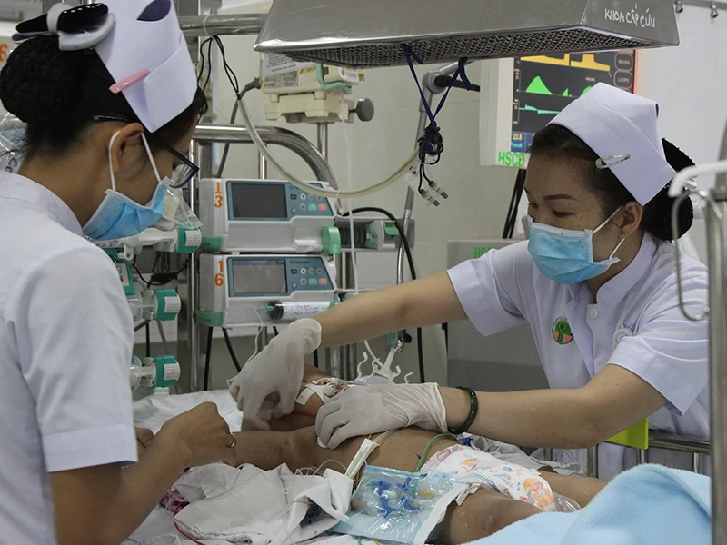 Bé trai bị điện giật được chăm sóc tại khoa Hồi sức cấp cứu BV Nhi đồng 2 (TP.HCM). Ảnh: HL