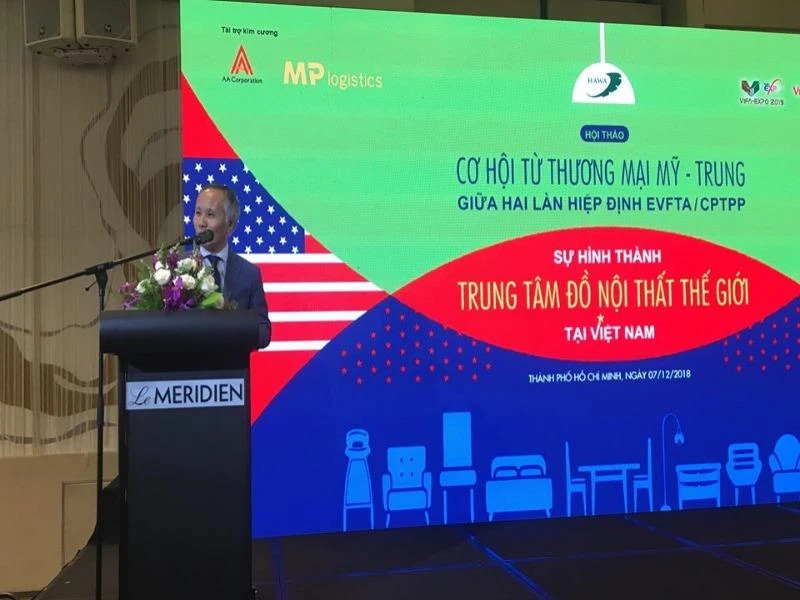 Phát biểu tại hội thảo chuyên sâu của ngành gỗ với chủ đề “Cơ hội từ chiến tranh thương mại Mỹ-Trung giữa hai hiệp định EVFTA/CPTPP và sự hình thành trung tâm nội thất thế giới tại Việt Nam”, Thứ trưởng Bộ Công Thương Trần Quốc Khánh cho hay nhiều chuyên gia cho rằng trong cuộc chiến tranh thương mại Mỹ-Trung về những mức thuế mà Mỹ đưa ra cho các mặt hàng Trung Quốc thì ngành chế biến gỗ của Việt Nam sẽ có cơ hội.