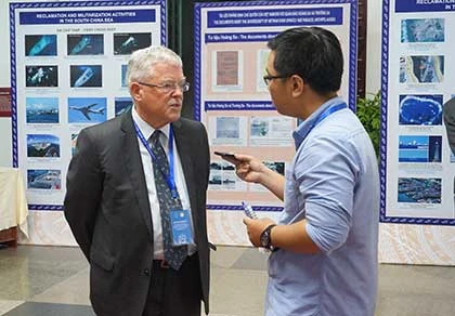 GS Carl A. Thayer trả lời phỏng vấn PV báo Pháp Luật TP.HCM tại hội thảo quốc tế “Những vấn đề pháp lý liên quan đến phán quyết của Tòa Trọng tài thành lập theo phụ lục VII Công ước Liên Hiệp Quốc về Luật Biển (UNCLOS) 1982” do ĐH Luật TP.HCM phối hợp cùng Hội Luật gia Việt Nam tổ chức ngày 23-7. Ảnh: NGÂN NGA