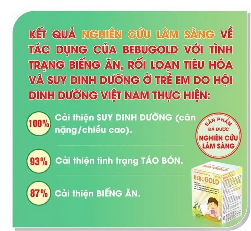 Kết quả nghiên cứu đánh giá tác dụng của Cốm vi sinh BEBUGOLD với tình trạng biếng ăn, rối loạn tiêu hóa, suy dinh dưỡng ở trẻ em tại Trường Mầm non Đồng Kỳ, huyện Yên Thế, tỉnh Bắc Giang cho thấy 100% trẻ suy dinh dưỡng chiều cao, cân nặng được cải thiện sau 2 tháng sử dụng.