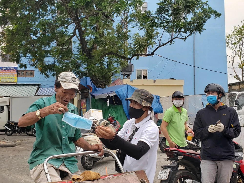 Ngoài phát cơm, CLB còn phát khẩu trang cho những người đến nhận cơm. Ảnh: T.AN
