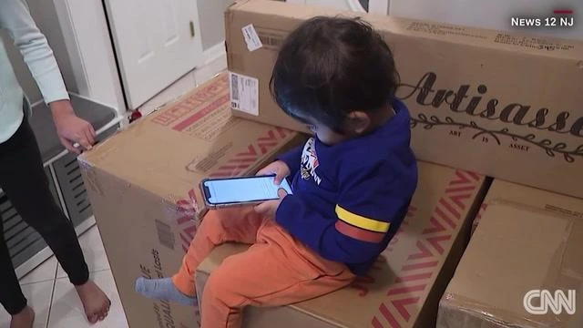 Cậu bé Ayaansh ngồi trên đống đồ nội thất mà cậu đặt mua và được giao tới tận nhà. Ảnh: CNN