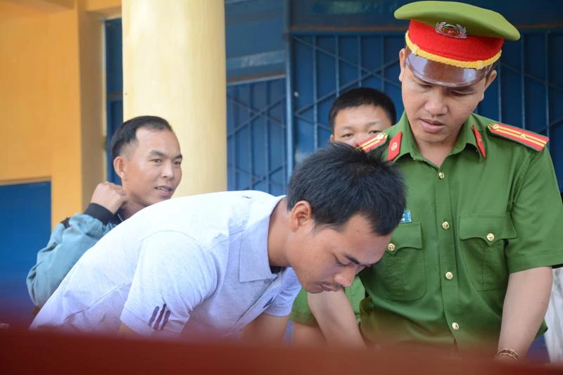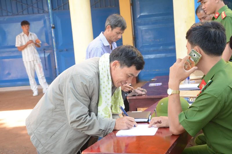 Thiếu tá Võ Văn Thụy hướng dẫn thủ tục cho anh Y-Phi-Du. Ảnh: NGUYỄN TRÀ