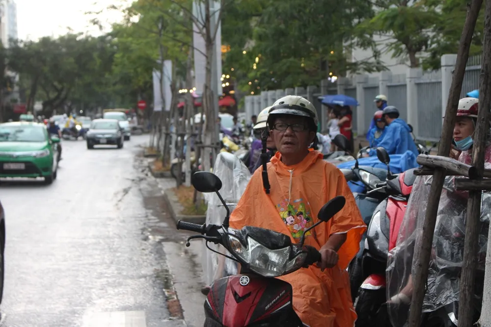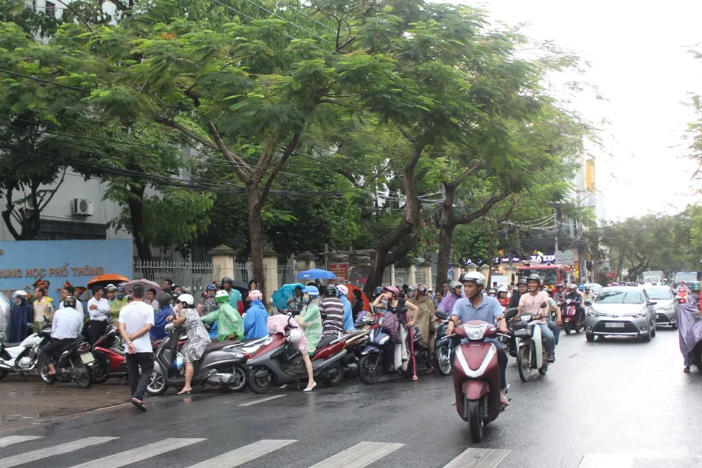 Dù trời đổ mưa to nhưng đông đảo phụ huynh vẫn đợi con trước cổng trường.